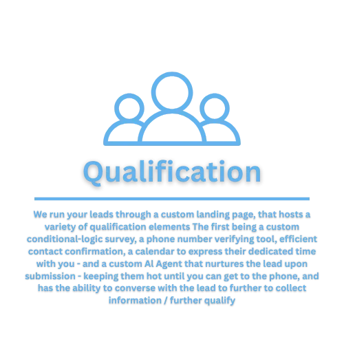We use a multi-step qualification process designed to filter out anyone who isn't a serious prospect. First, we run highly targeted ad campaigns that speak directly to your ideal homeowner. Each lead is then sent to a landing page with a qualification survey built around the criteria you set. We confirm their contact information, nurture them through automated follow-up messages to keep them engaged. and send automated reminders to confirm appointments, so by the time you speak with them, they're warmed up, vetted, and ready for a real conversation.